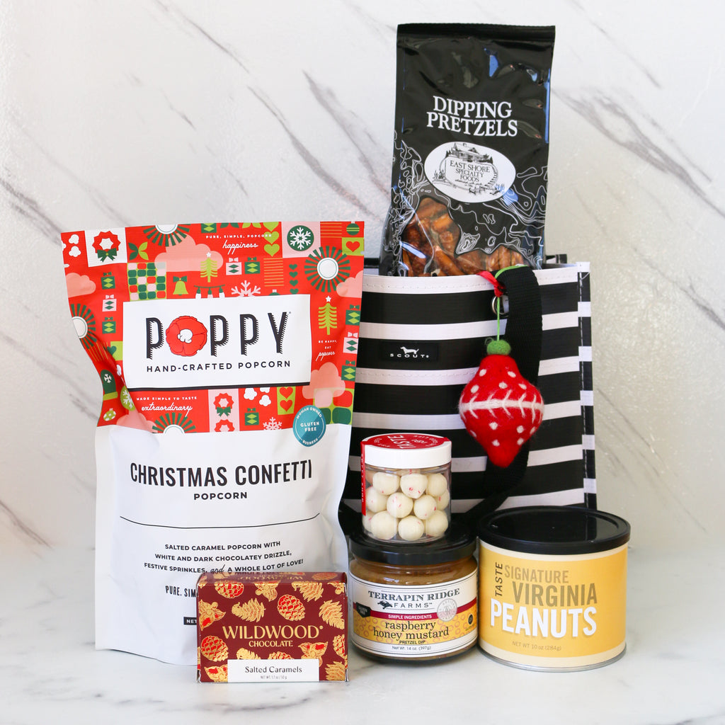 Add a little merriment to our classic SCOUT gift with this cheerful collection of snacks and holiday treats—perfect for delightful, anytime surprises. Ideal as a hostess gift, a thoughtful thank-you, or an impromptu festive gesture, it ships to all states and brings holiday joy to all ages.