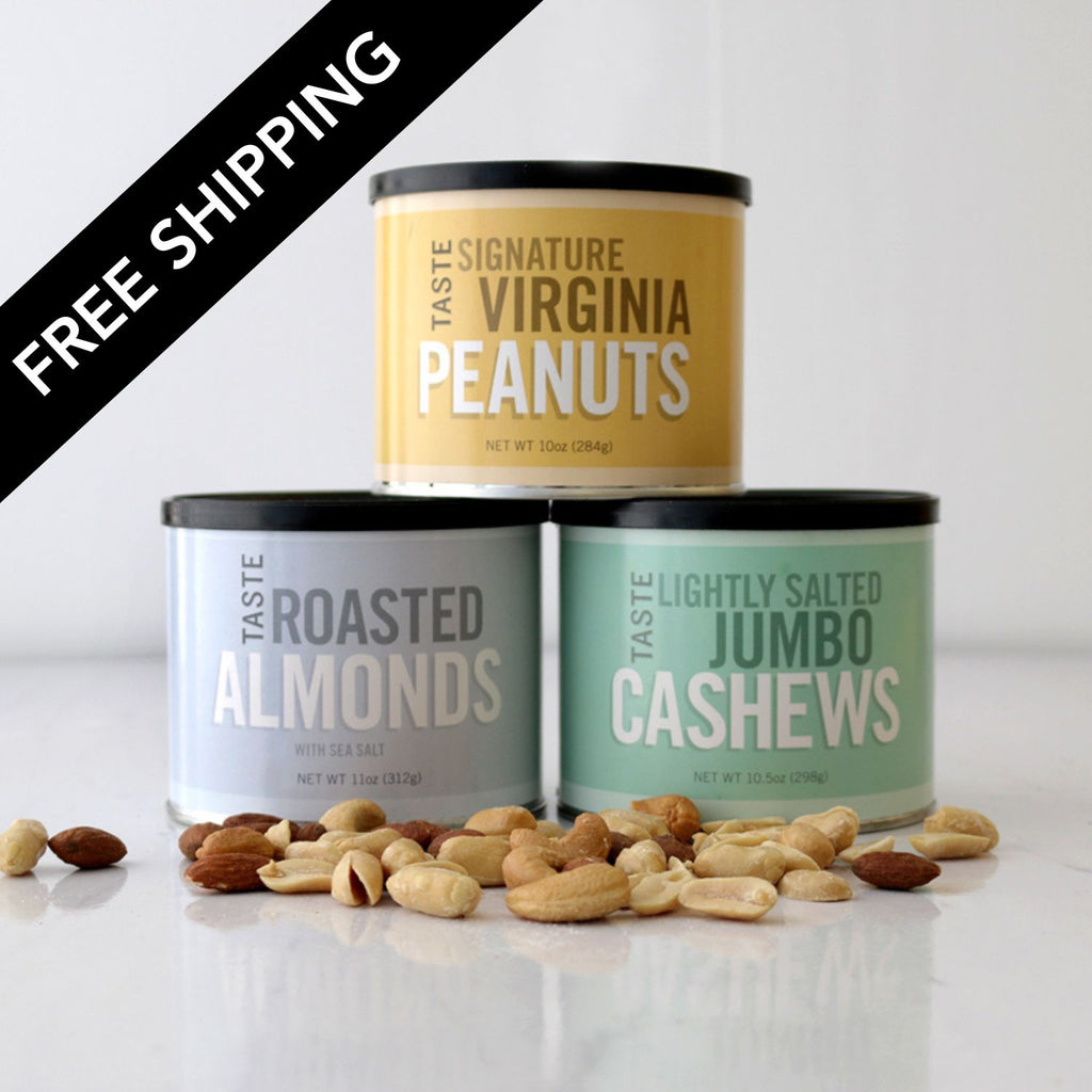 This exclusive gift set features TASTE Roasted Almonds with Sea Salt, TASTE Signature Virginia Peanuts, and TASTE Lightly Salted Jumbo Cashews.