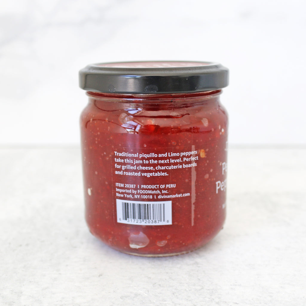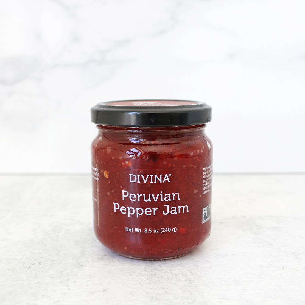 This is not like the pepper jelly you've had before. Sweet and smoky piquillo peppers balance the heat from spicy Limo peppers to deliver a depth of flavor you'll dream of long after the jar is emptied. Divina Peruvian Pepper Jam is a beautiful accompaniment to soft cheese and flatbread crackers or atop grilled steak bruschetta.
