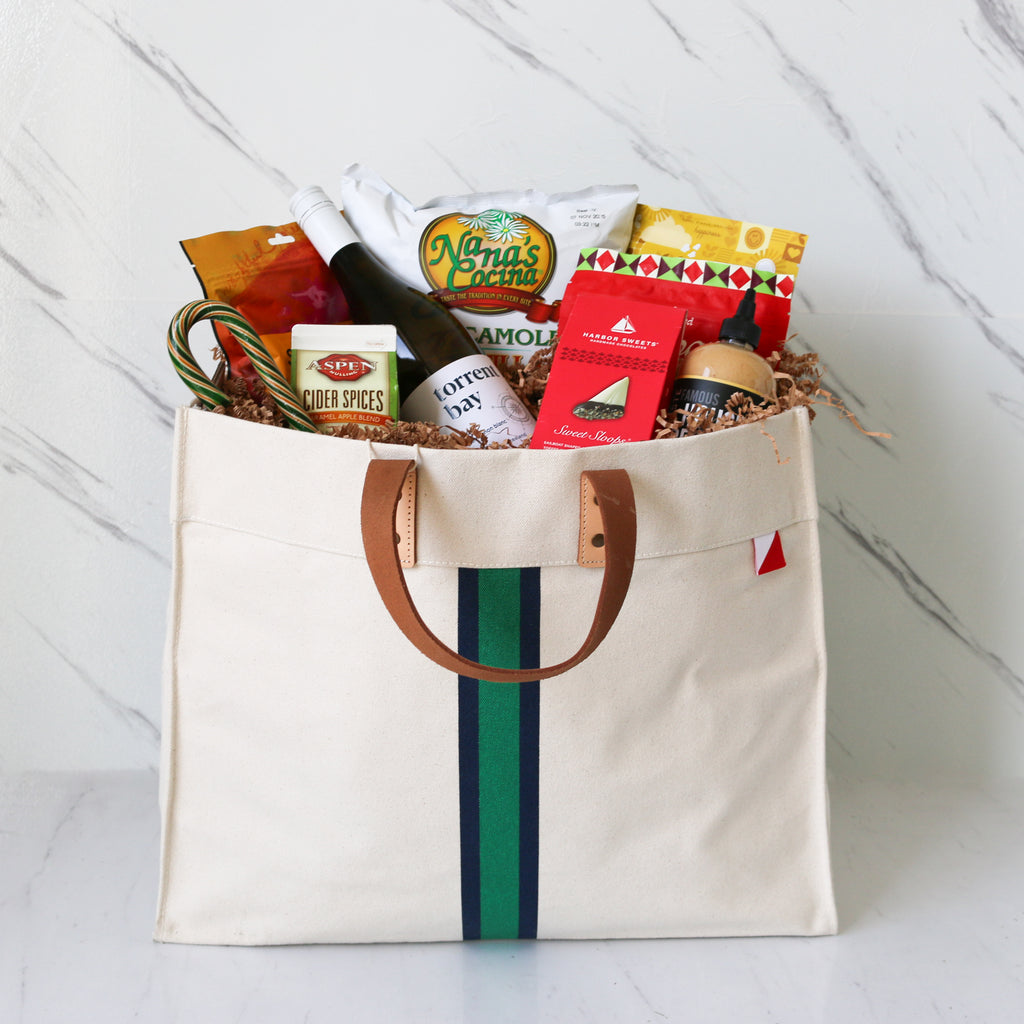 A collection of munchies and treats for a weekend with friends or a family get-together. The SHOREBAGS - Striped Canvas Tote is stuffed with goodies for everyone to share and explore from traditional favorites like crunchy chocolate chip cookies made in Texas to new discoveries like melt-in-your-mouth lemon cookies from Scotland and Coffee & Cream pretzels made in New York. Consider the snack run "all done"!