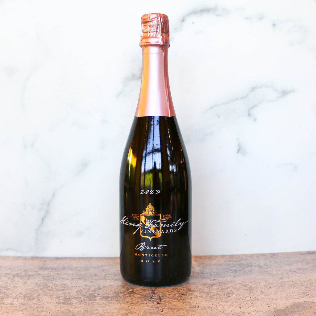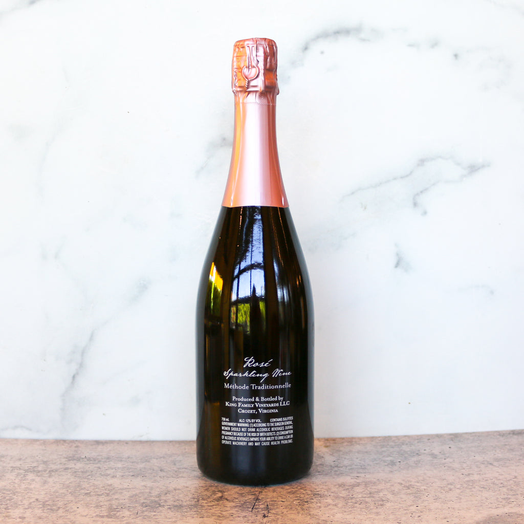 The Brut Rosé is King Family's flagship sparkling wine, made using the same traditional Champagne method that the estate has worked with since partnering with French sparkling wine specialist Claude Thibaut. The 2023 Brut Rosé earned a Gold Medal at the 2026 Virginia Governor's Cup, continuing King Family's record as one of Virginia's most decorated sparkling wine producers.