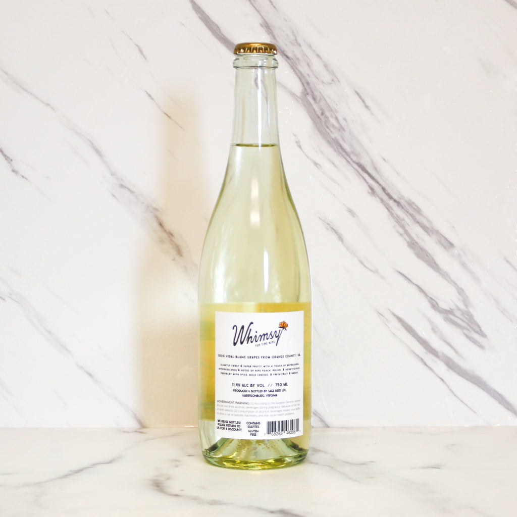 Love Song is a Vidal Blanc from Sage Bird Ciderworks in Harrisonburg, Virginia, released under their new Whimsy wine label. It is slightly sweet and slightly sparkling: the kind of bottle you crack on a warm evening without overthinking it. Vidal Blanc, one of Virginia's most food-friendly and cold-hardy white grapes, brings forward flavors of peach and watermelon rind with a natural brightness that makes this wine feel effortless from the first pour.