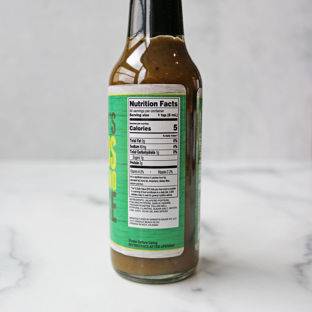 Speedy's mildest sauce made from jalapenos and poblanos, with the tang of lime juice and the brightness of cilantro. Made from fresh produce and locally grown peppers.