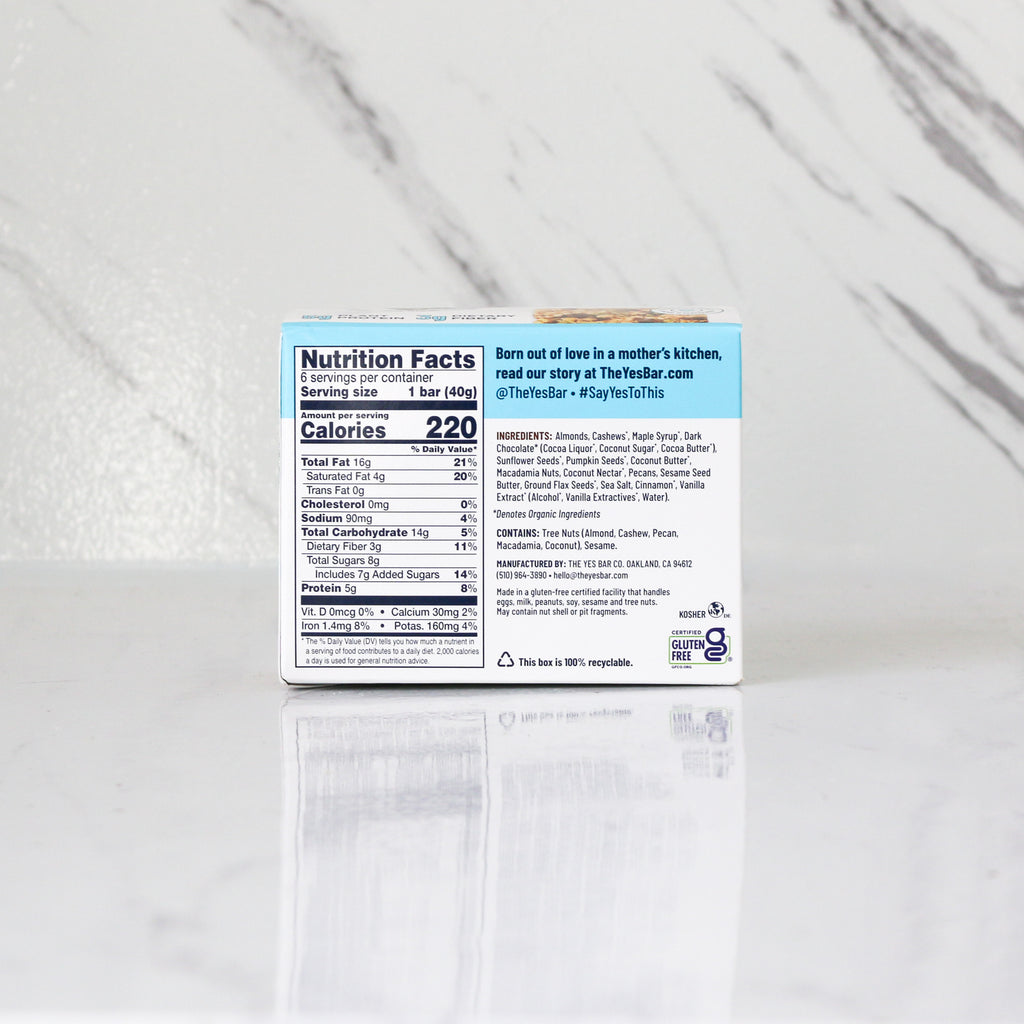 A cozy twist on a classic. This Yes Bar packs in rich dark chocolate chips, warm cinnamon, and fragrant vanilla for a chewy, nutty bite that feels both indulgent and wholesome. Gluten-free, vegan, and made with real, clean ingredients, it’s snack time with a little extra comfort baked in.